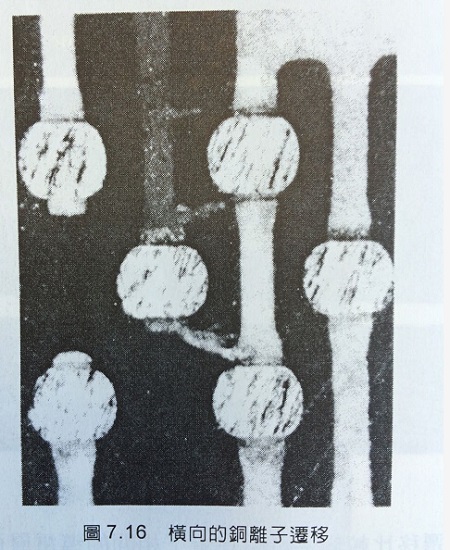 一般高密度增層線路板的故障模式主要有兩種。第一種如圖7.15為導(dǎo)體層間的銅離子遷移,對(duì)半徑只有0.87A的銅離子而言,環(huán)氧樹脂可視為是海棉狀的結(jié)構(gòu),因此銅離子如果受到導(dǎo)電層間電壓的影響很容易通過環(huán)氧樹脂而由陰極到達(dá)陽極形成樹枝狀的銅析出物。